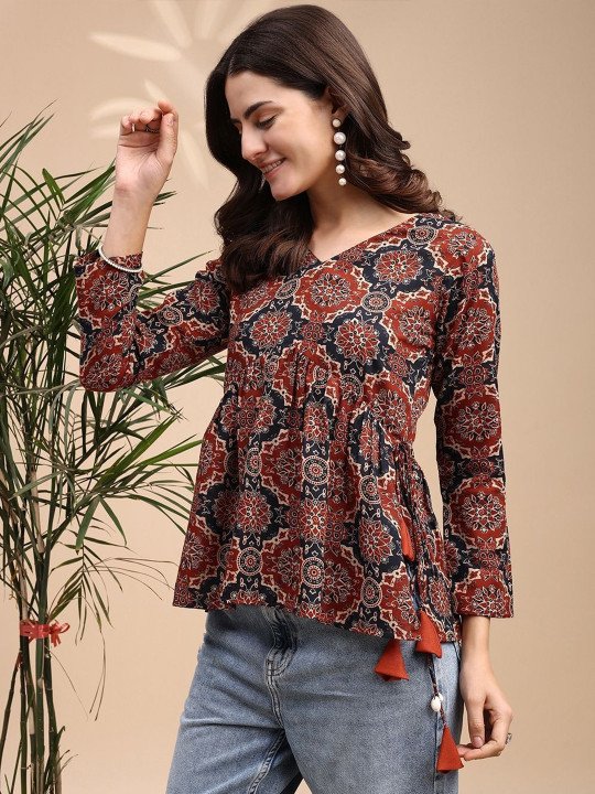 Women Ajrak Print Alia cut Peplum Kurti With Tassles and Kodi